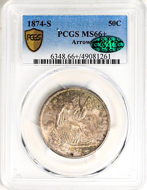 ARROWS. GEM LUSTROUS SURFACES WITH LIGHT SEA GREEN AND AMBER PATINA. TIED WITH ONE OTHER COIN FOR HIGHEST GRADED. CAC.